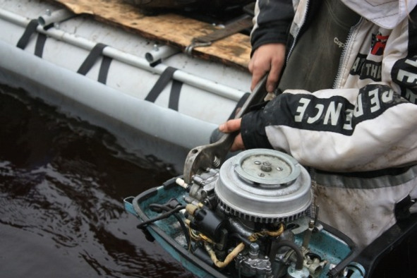А резинка начинает отставать. И «ракета» идёт пока на средних оборотах – движок же новый. Тем не менее, пытаемся замерить определяющие параметры – скорость и расход топлива. «Ракета» идёт примерно 6 км в час, добавление оборотов до максимума дает целых семь с половиной – похоже, с графиком я просчитался. Идти на полных 7 с половиной – смысла нет, поскольку такой режим увеличивает расход топлива почти вдвое – не та плата за полтора километра в час выигрыша. От измерений отвлекает вдруг замолкший «Ветерок», поначалу установленный на резинку. Ага, наскочили, то ли на камень, то ли на перекат, и срезали шпонку. 19—30, ремонт. Димон параллельно занят тонкой настройкой двигателя.