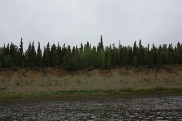 В 9—15 проходим приток Нижняя Айпа. (Левый орографически. Чтоб не путаться дальше, я везде левый-правый буду обозначать именно с точки зрения течения реки, а не нашего хода. Поскольку мы идём против течения, то «левый» орографически находится справа от нас, и это сыграет со мной однажды забавную шутку.) Сразу за притоком к берегам вплотную подходят леса, над которыми возвышаются первые в нашем походе лиственницы. Ещё в километре Пёза разделяется на две протоки островом, напротив которого, на левом берегу – изба, которую проводники называют Керосинная.