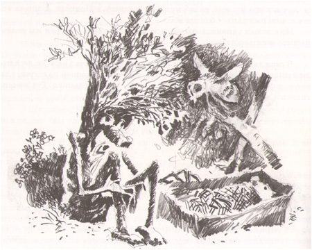 Однажды сюда пришли три очень грустные девочки. Их звали Юля, Катя и Таня. Они принесли что-то в маленькой картонной коробочке. Девочки вырыли ямку, достали из коробки мёртвого мышонка, завернули его в кружевной лоскуток, перевязали ленточкой и положили опять в коробку, а её – в ямку. Затем повздыхали над мышонком и даже чуть не заплакали. Засыпали ямку землей, сделали из двух щепочек крестик и воткнули его над холмиком. Нарвали одуванчиков, утыкали ими последний приют мышонка. Сплели веночек и повесили его на крестик. Таня протянула руку к цветку шиповника, чтобы сорвать его, но Шуршеня заставил двух шмелей перелететь именно на этот цветок. Таня потянулась к другому цветку – туда тотчас перелетела оса. Тогда девочка сорвала кустик полыни и воткнула его в холмик – получилось маленькое деревце.