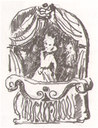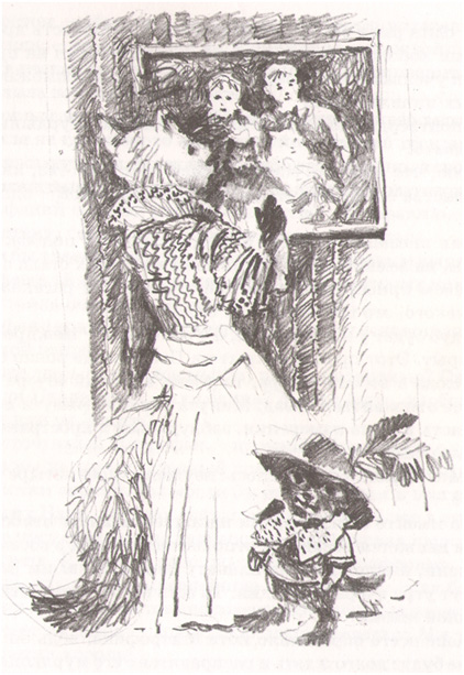 Тут вошёл котёнок в коротких штанишках, в курточке с большим кружевным воротником, в берете, надетом на одно ушко. Это был паж принцессы Пампуши. Он что-то шепнул ей на ухо. Принцесса взглянула на своих гостей растерянно. Потом спинка её напряглась, хвост изогнулся, и она повелительно сказала пажу: