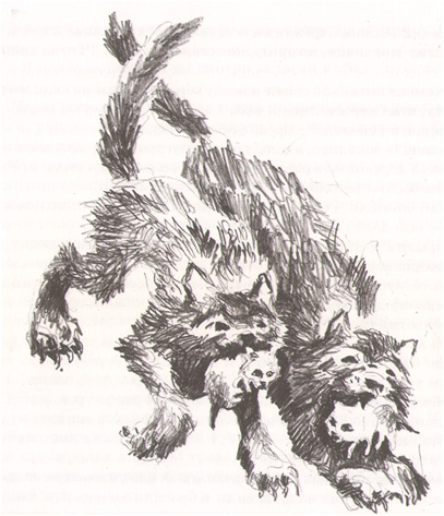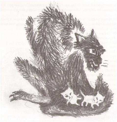 Колдунья вошла к детям. Серёжа и Маша взглянули на неё вопросительно. Сразу было ясно, что это очень старая кошка. Вся чёрная, она была единственной среди чёрно-белых котов Епифании.