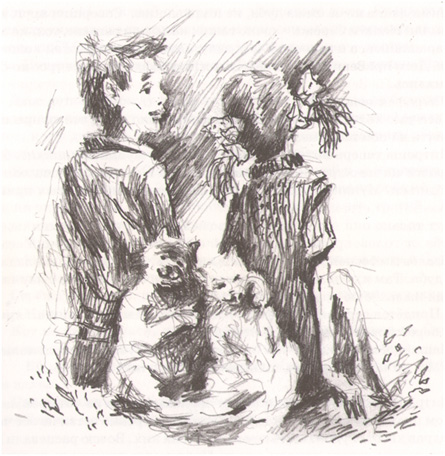Серёжа быстро спустился по стволу и, не успел одноухий что-либо сообразить, ударил его под коленку, подвернул лапу на спину и уложил на живот. Со вторым справился ещё быстрее. Лиловые вскочили на задние лапы и, оскалив зубы, двинулись прямо на малыша – казалось, сейчас разорвут его на части. Маша смотрела на них с ужасом, но уже приготовилась прыгнуть из дупла, чтобы хоть одному из лиловых расцарапать нос. Но Серёжа уселся на пенёк и утихомирил драчунов:
