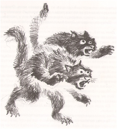 Привлечённые шумом, в самый разгар драки, на ту сторону, куда падала густая тень от дуба, вылезли лиловые коты. Драчуны увидели их почти одновременно: два ярко-лиловых кота, выпуская и втягивая ужасные когти, стояли на задних лапах.