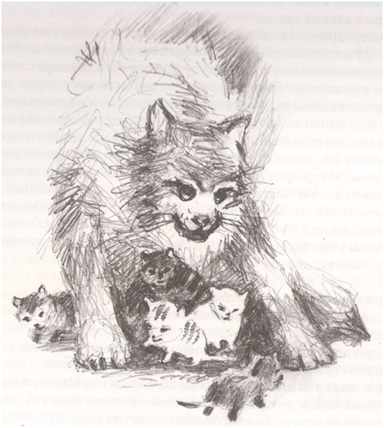 Котят родилось четверо. Одна кошечка была беленькая, другой котик, как Митрошка, трёхцветный, и ещё два замечательных чёрно-белых котёнка. Они были такие крохи, что умещались в ладошках у ребят, но уже обсохли и слегка распушились. Все четверо жадно сосали молочко, смешно отпихивали друг друга, чавкали, трогательно негромко пищали и отваливались от мамы с толстенькими животиками.