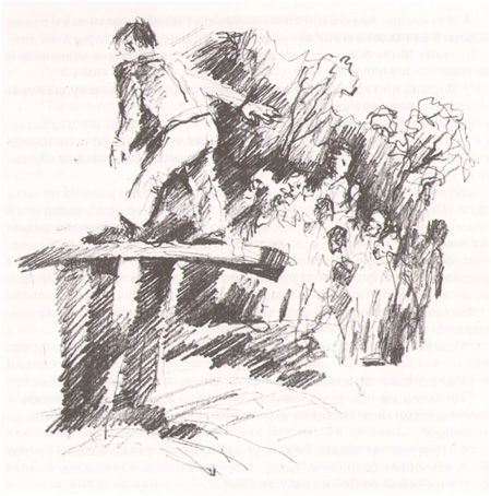 "Не такая уж и высота, – сказал он себе, – всего-то метров девять". Шмыгнул носом, решительно вытер кулаком под ним – и сделал шаг…