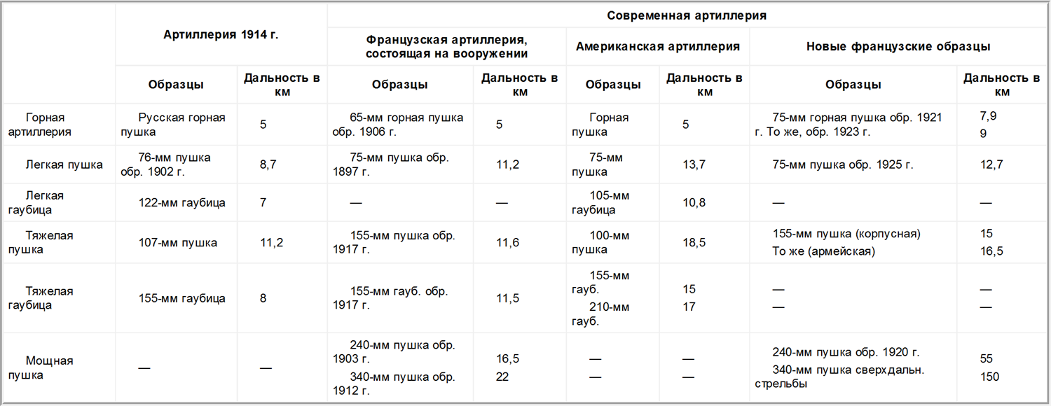 Эта таблица характеризует эволюцию артиллерии с 1914 г. Мы видим, что в ходе войны материальная часть артиллерии преобразилась, дав по всем образцам увеличение дальностей стрельбы от 27 до 81 % против норм довоенного времени.