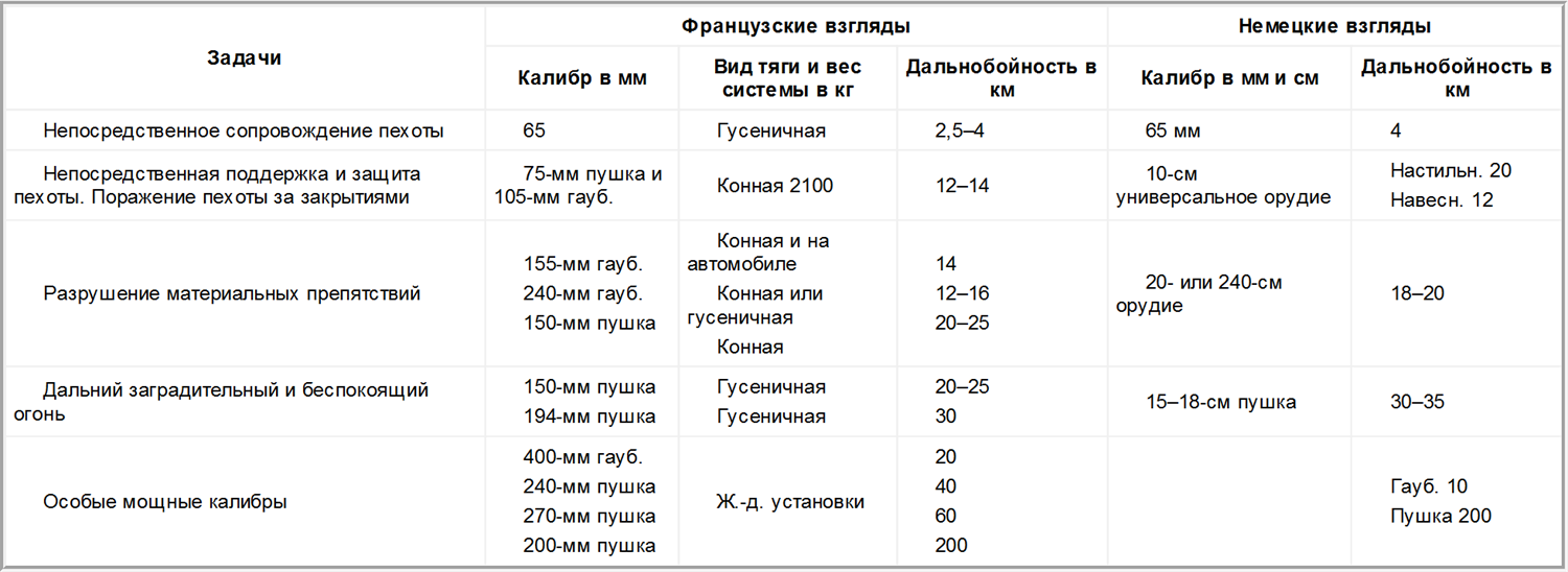 Мы можем привести для примера те условия, которым, по мнению французских и немецких артиллеристов, должна отвечать новая материальная часть артиллерии (см. табл. на с. 30).