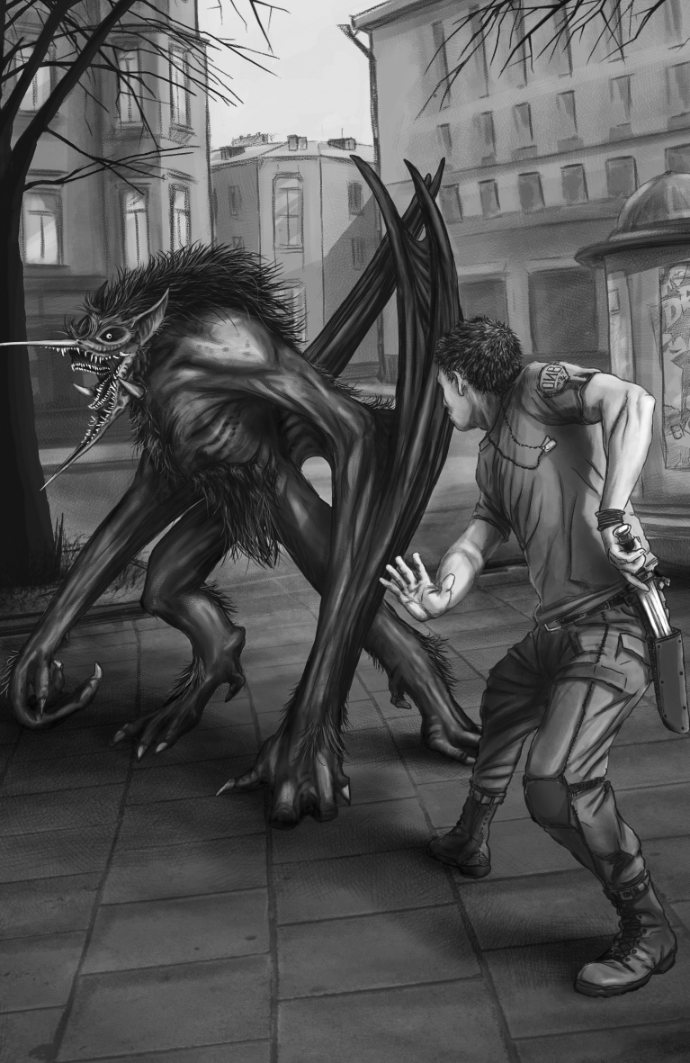 Вампиры напали практически одновременно. Того, что спикировал слева, Сергей сразил с первого выстрела, прострелив ему голову. Второй оказался хитрее. Видя, какая участь постигла его собрата, сообразительный кровосос сделал вид, что готов улететь. Быстро махая крыльями, он поднимался все выше и выше. Алёхин выстрелил в него два раза. Мимо. Выстрелил третий раз. Щелчок, осечка. В ту же секунду вампир совершил стремительный разворот и ринулся вниз, будто коршун, атакующий цыплёнка. Времени менять обойму уже не было. Одним движением затолкнув в кобуру пистолет и выхватив из-за пояса боевой тесак, Серж приготовился к рукопашной. Когда между противниками оставалось не более метров двух, стрелок нырнул вперёд, перекувырнулся через голову, уйдя с линии атаки, и тут же вскочил на ноги, держа наизготове оружие. Вампир плюхнулся на то место, где секунду назад был человек, грузно и неловко, будто курица. И в тот же миг Сергей одним ударом тесака отсёк ему левое крыло. Кровосос завертелся на месте и заверещал истошно, будто целая дюжина поросят на бойне. Воспользовавшись этой заминкой врага, Серж вторым сильным и точным ударом сбоку отсёк кровососу голову. И тут случилось то, чего старший стрелок ОИВ не ожидал вовсе: со спины на него обрушился третий вампир, которого он, на свою беду, не заметил сразу. Вампир вонзил Сергею между лопаток острые, как ножи, когти, разрывая в клочья крепкую ткань комбинезона, будто кухонную салфетку. Превозмогая дикую боль, Алёхин попытался, изогнувшись, словно йог, дотянуться до вампира руками. Ему это не удалось. К тому же он выронил тесак, который, звонко ударившись об асфальт, отлетел далеко в сторону. Серж резко упал на спину, изо всех сил давя мерзкую тварь собственным весом. Вампир глухо хрюкнул, внутри него что-то щёлкнуло, и кровосос ослабил хватку. Тут же Алёхин рванулся изо всех сил, чувствуя, как когти-ножи нещадно полосуют мышцы на его спине, и, оставив в лапах хищника добрый кусок своей плоти, не давая врагу опомниться, насел на него сверху. Наступив коленом на перепончатое крыло, стрелок начал нещадно молотить кулаками вампира по голове. Хрустнул и повис на тонкой ниточке острый, будто стилет, клюв кровососа. Под нелепо повисшим клювом открывалась и закрывалась широкая, полная острых зубов пасть. Из пасти жутко смердело. Но Сергей не замечал этого. Истекая кровью, медленно теряя силы, он всё бил, бил, бил… И кричал, брызжа слюной пополам с кровью: