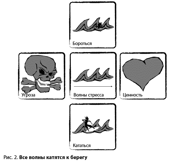 Жизнь часто сравнивают с океаном. Стресс же подобен волне, которая поднимается при столкновении с чем-то пугающим или привлекательным. Чем важнее событие, тем сильнее волна энергии, предназначенной в одном случае для борьбы или побега от того, что пугает, в другом – для того, чтобы поймать/захватить или догнать то, что нравится. Иными словами, целью стресса всегда является выживание и/или удовлетворение базовых потребностей, а его волны всегда направлены от «пугающего» к «привлекательному» (рис. 2). Таким образом, волна стресса всегда ясно указывает на потребности, удовлетворение которых оказывается под угрозой или, напротив, становится возможным в сложившейся ситуации.