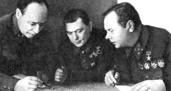 Военный совет Волховского фронта. Справа налево: К.А. Мерецков, А.И. Запорожец, Г.Д. Стельмах