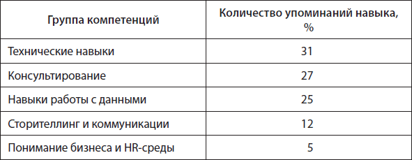 Как видно из таблицы, группа «Технические навыки» оказалась самой большой среди всех требуемых навыков (31 %), за нею идет «Консультирование» (27 %), затем «Навыки работы с данными» (25 %), «Сторителлинг и коммуникация» (12 %) и, наконец, «Понимание бизнеса и HR-среды» (5 %).