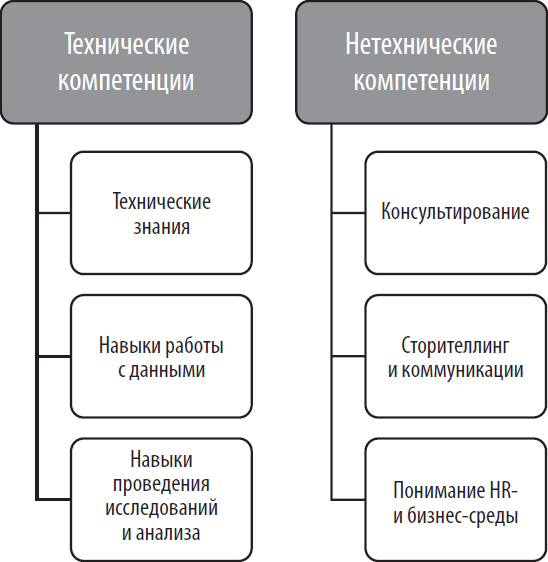 Блок технических навыков описывает уровень владения прикладными программами и навыками, позволяющими решать задачи в области HR-аналитики, тогда как блок нетехнических навыков описывает компетенции в области бизнес-коммуникаций, понимания бизнеса и среды работы компании.