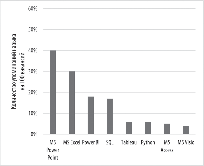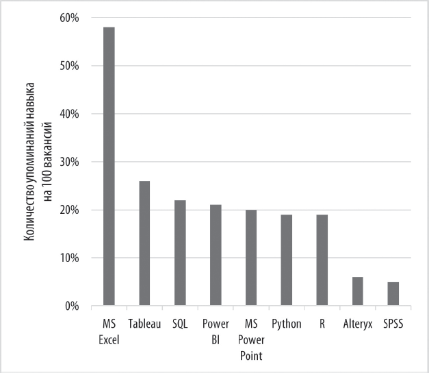 Из диаграммы видно, что более чем в половине опубликованных вакансий упоминался Excel (58 %), за ним с заметным отрывом шли: Tableau (26 %), SQL (22 %) и Power BI (21 %). Остальные технические инструменты фигурировали менее чем в 20 % публикуемых вакансий.