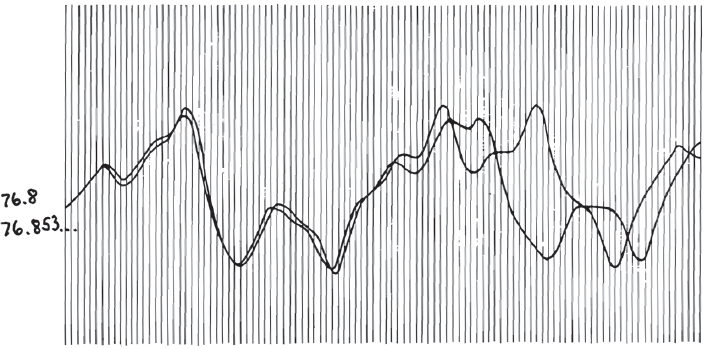 Лоренц решил подробнее изучить уже построенный машиной график. В качестве начальных данных он ввел значения переменных из середины прогноза. Система должна была бы точно воспроизвести вторую половину графика, ведь условия (температура, давление и пр.) не изменились, и продолжить строить его дальше. Однако Лоренц обнаружил нечто совершенное иное – графики оказались разными. Причем если вначале график еще более или менее повторял исходный вариант, то к концу не имел с ним совсем ничего общего. И чем на более отдаленное время система строила прогноз погоды, тем сильнее итоговый график отличался от исходного (см. рис. 1.6).