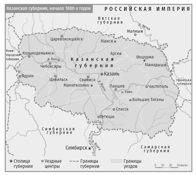 В Крыму и Казани существовали разные модели расселения этнорелигиозных групп. Русские заселяли всю Казанскую губернию, составляя большинство или значительное меньшинство практически во всех уездах (см. карту 4)349. Татары составляли большинство населения в Мамадышском и Казанском уездах (за исключением самой Казани, которая была преимущественно русской), а также в Тетюшском уезде. Значительная доля русских и татар проживала в Чистопольском, Лаишевском, Спасском и Свияжском уездах. В западной части губернии, напротив, преобладали черемисы (Царевококшайский уезд) или чуваши (Ядринский, Цивильский, Козьмодемьянский и Чебоксарский уезды); русские составляли от 9% до 23% населения западной половины губернии, в то время как татары были заметно представлены (более 20%) только в Царевококшайске.