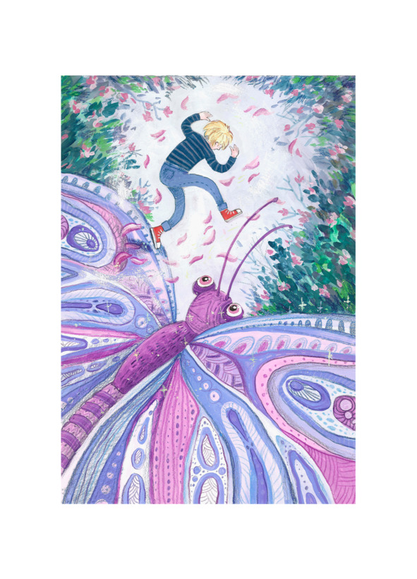 Мика с его помощью взобрался на крыло – оно казалось очень упругим, – подпрыгнул раз, совсем невысоко. Когда ноги вновь коснулись крыла, показалось, будто он слегка в них увяз. Затем бабочка взмахнула левым крылом, и Мика подлетел высоко-высоко. От волнения он даже забыл, что должен делать дальше. Достигнув верхней точки своего полета, он стал стремительно падать вниз. Ему захотелось просто закричать, он стал изо всех сил махать руками, не считая, сколько раз получилось, и не думая о синхронности. Соединил ноги, уже плюхнувшись попой на крыло бабочки. Но и это сработало: прилетели лепестки цветов шиповника, закружили его, и он полетел вместе с ними вверх вокруг домика-замка Волшебника.