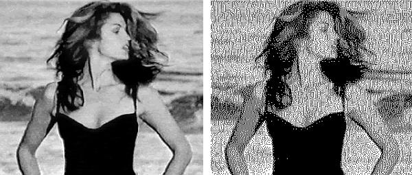 Минимально возможная глубина пиксела, равная 2, позволяет представить лишь два цвета – черный и белый (рис. 1.4, б) – и подходит для графического хранения черно-белых документов с линейной графикой (line art).