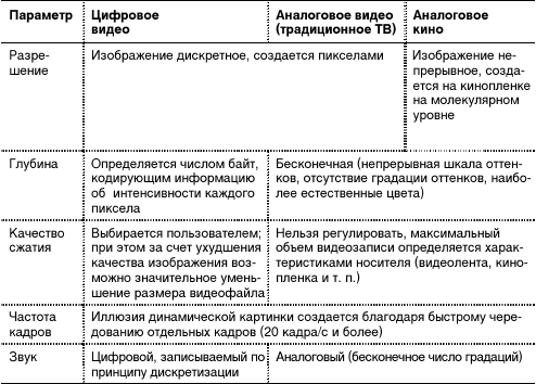 Принцип покадрового видео, как вы знаете, лежит в основе традиционного (аналогового) кино и телевидения. Отличие компьютерного представления видео проявляется лишь на изложенных нами ранее характеристиках отдельных кадров видео как компьютерных изображений. Сведем все то, о чем мы уже рассказали, и то, о чем только собираемся рассказать, в одну таблицу (не касаясь пока звука, рассматриваемого в следующем разделе).