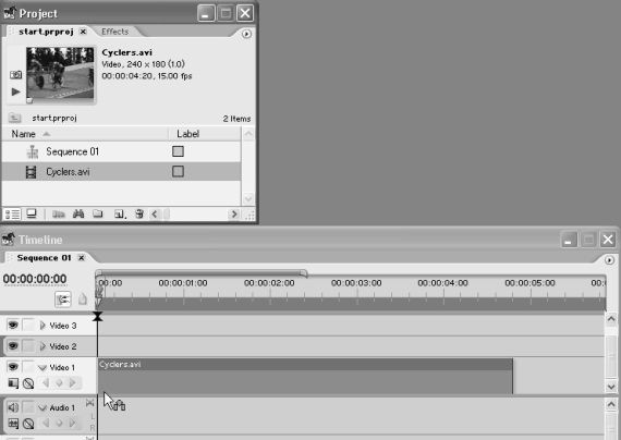 Рис. 2.17. Для вставки клипа в фильм перетащите его из окна Project в окно Timeline