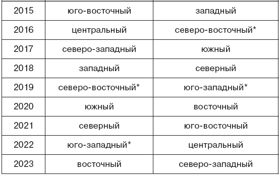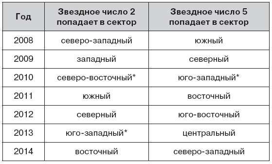 Участки, несущие трудности и болезни, занимают северо-восток (2) и юго-запад (5). Следовательно, по 2023 год включительно квартиры с входом, расположенным на северо-востоке и юго-западе, а также комнаты, находящиеся в этих секторах или имеющие окна в этих направлениях, будут подвергаться плохому влиянию. Когда в эти же секторы попадут неблагоприятные летящие звезды года, опасность удвоится (таблица 1.5) (эти секторы отмечены звездочкой).