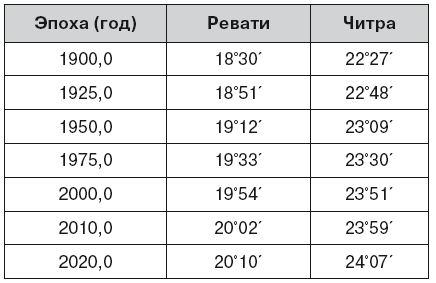 Подвижный (тропический) зодиак начинается от точки весеннего равноденствия, а за счет прецессии земной оси эта точка перемещается среди звезд со скоростью 50,27±0,03 угловых секунды в год, или 20,95 угловых минуты за 25 лет. Поскольку неподвижный (ведический) зодиак привязан к звездам, то величина айянамсы зависит от времени, или эпохи (таблица 1.6).
