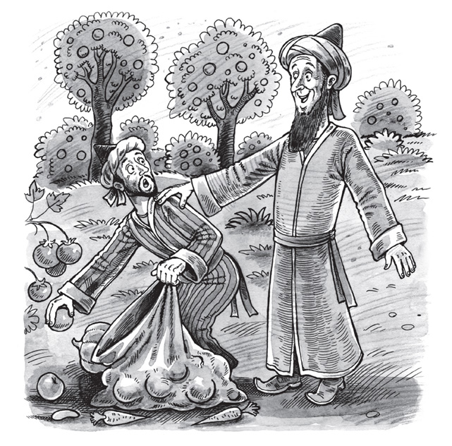 Ходжа Насреддин подхватил мешок и, понурившись, вышел за калитку. Бесцельно брёл он по пыльной дороге, размышляя, где бы перехватить хотя бы десять таньга, как вдруг заметил у самой кромки лёгкую изгородь, а за ней чей-то огород. Чего там только не было! Лук, морковь, петрушка, укроп, помидоры, огурцы, тыква – всего не перечесть. Не раздумывая, он перемахнул через забор и принялся набивать мешок всем подряд.