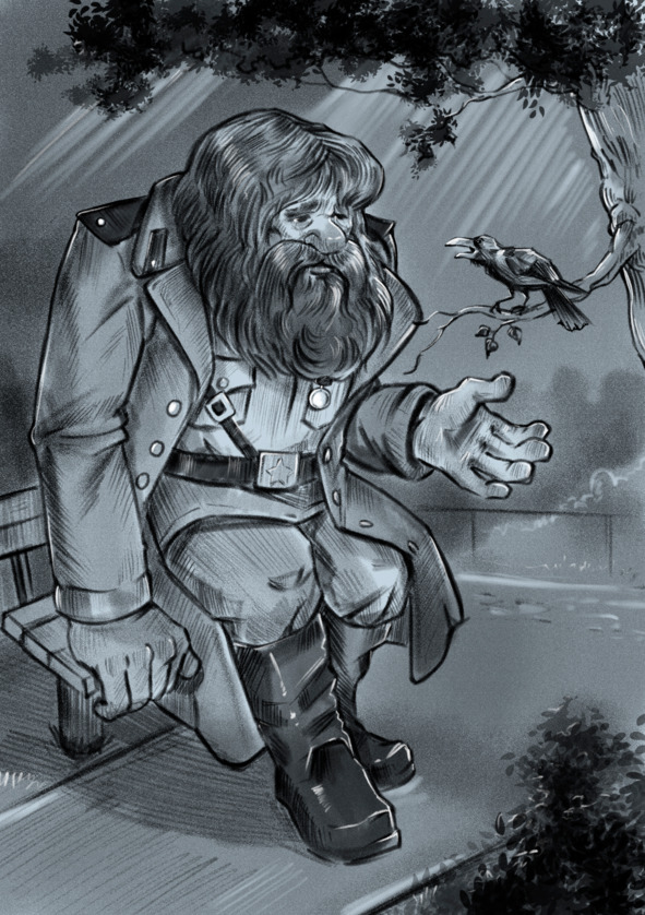 Настя замерла от удивления. Напротив ее окна второго этажа на скамейке сидел великан с длинной спутанной бородой, одетый в грязную потертую шинель, и вел беседу с черным вороном. Вначале она даже не осознала, что видит, настолько поразил ее вид незнакомого мужчины. Для начала, он был одет как солдат, точнее, как раньше одевались солдаты еще в войну. Из-под распахнутой шинели виднелась темно-зеленая гимнастерка со стоячим воротником и большими карманами на груди, перехваченная толстым кожаным ремнем-портупеей. Слева на широкой груди виднелась маленькая медалька. На ногах были ватные форменные штаны, заправленные в кирзовые сапоги. (Настя точно знала, как одевались солдаты прошедшей войны, мама не раз одевала ее в такую форму на парад 9 мая.) Лицо солдата-великана тонуло в густой бороде, из которой торчал только красный нос картошкой. Глаза прятались под нависшими густыми бровями. На растрепанной голове сидела выцветшая фуражка. Пригладив свою густую бороду, странный солдат спросил: