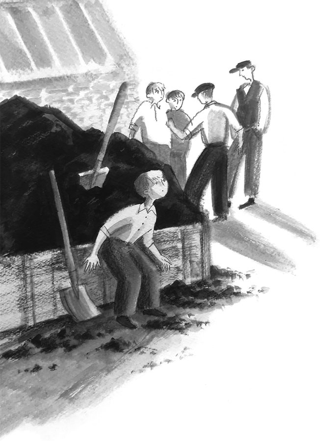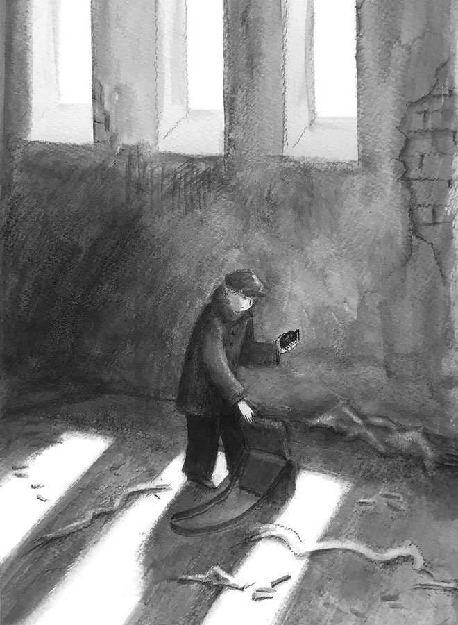 Я встал и на цыпочках вышел в коридор. Дверь в комнату родителей была приоткрыта. Мне показалось, что она полна людей. На самом деле их было немного. Четверо военных и папа. Военные разбирали вещи и книги, будто мы собирались переезжать. Пол был завален вещами, папиными чертежами и раскрытыми книгами. Военные говорили вполголоса, но все вместе, и ничего было не разобрать. Только папа молчал. Он посреди комнаты на табурете сидел. Почему-то в той же белой рубашке. Бабушка не успела ее зашить – шов разошелся и нитки торчали. Он увидел меня, кивнул и улыбнулся: всё, мол, в порядке. Тут меня за плечо ухватила бабушка, что-то прошипела и оттащила обратно в постель.