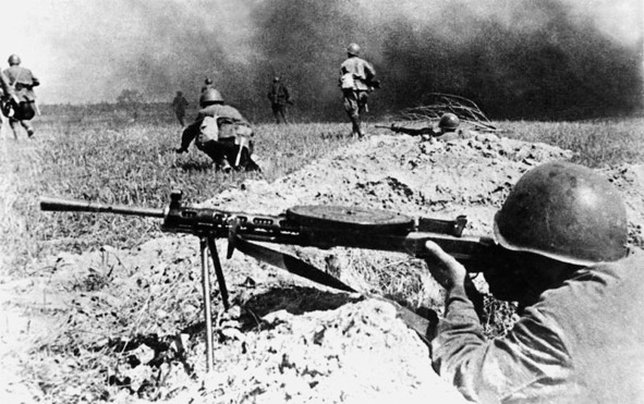 – Все происходило очень быстро, и мы даже не замечали, что и как делаем. Ворвались в траншею – очередь вправо-влево, бросили по паре гранат и дальше вперед. Даньшин напоролся на пулемётную очередь – буквально срезало его, Олег Степанов кидает гранаты, два пулемёта с расчётами уничтожил, Азельханов – гранату в блиндаж, Интагалиев сходу стреляет по немцам в траншее. Кто-то из них бежит, кто-то бьёт по нам, кто-то уже руки поднимает. Из церкви выскочил немец – я его из автомата, у него ещё снайперская винтовка была и «Парабеллум» за ремнём…