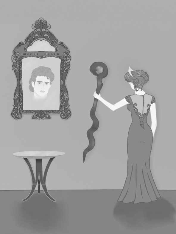 В это самое время королева, мачеха Белоснежки, стояла возле огромного зеркала с кубком вина в руке и рассматривала своё отражение.