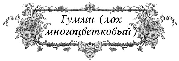 Это близкий родственник облепихи. Его родина – Китай. Растет гумми и в Японии, откуда он попал в нашу страну во время оккупации Южного Сахалина японцами. Это невысокий кустарник (высотой 1–1,4 см). Очень декоративен из-за красивой формы куста и серебристых, довольно крупных, блестящих листьев. Цветет гумми поздно, в конце июля-начале августа. Цветки у него удлиненной колокольчатой формы, с приятным и сильным ароматом, который привлекает насекомых-опылителей. В плодоношение куст вступает на третий-четвертый год и в возрасте 12–15 лет может давать до 15–20 кг с куста. Плоды в зрелом виде окрашиваются в красивый ярко-желтый с оранжевым оттенком цвет, покрыты серебристыми точками, из-за чего они буквально светятся. Они некрупные, около 2–3 см в диаметре, слегка продолговатые. Ягоды имеют хороший, но, на мой взгляд, пресноватый вкус. Внутри плодов находится одна продолговатая, довольно крупная косточка. Плоды висят на длинных плодоножках, что существенно облегчает их сбор по сравнению с облепихой. Их можно замораживать, делать из них компоты, желе, соки, вино, варенье, в которое следует добавить немного лимонного сока, иначе у него будет пресный вкус.