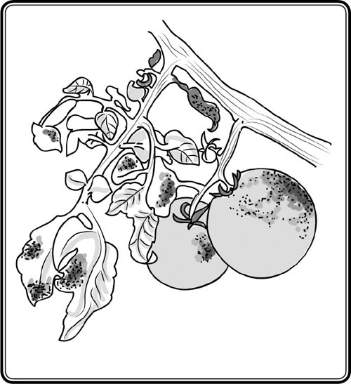 Если сначала на нижних, а затем и остальных листьях появились черные пятна, которые затем начинают увеличиваться, а вокруг них образуется желтое пятно, это грозное заболевание томатов фитофтора – гриб, который живет в почве, но только если в ней недостаточно меди. Отсюда и профилактика заболевания: перед посадкой почву полить хлорокисью меди (ХОМ, «Осихом», «Полихом») или медным купоросом, либо воспользоваться препаратом «Профит»: 1 столовая ложка препарата на 1 л воды для поливки почвы или 1 чайная ложка препарата на 10 л воды для опрыскивания по листьям (имейте в виду, что после опрыскивания плоды нельзя есть 3 недели).