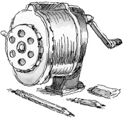I asked if anyone needed help. Mel fumbled with her pencil sharpener. I heard crickets chirping in Sarah’s empty head. Then I walked to the back of the room and looked at the floor. I heard pencils and paper, the steady breathing of humans at work. I stood behind the printing press, my hands on the wheel, like a sea captain trying to get on course.