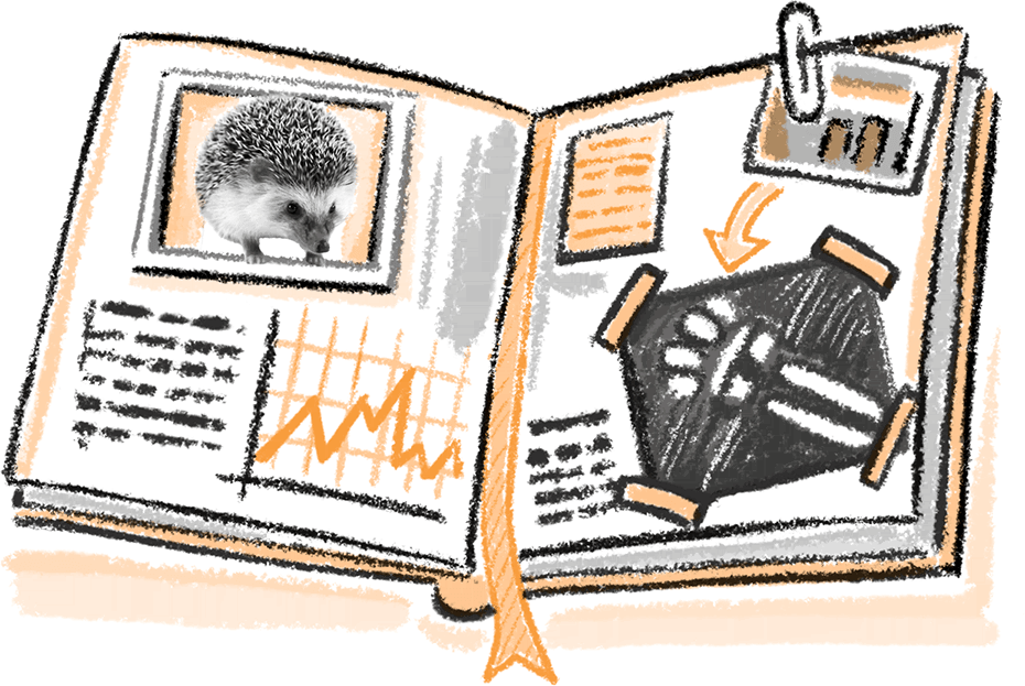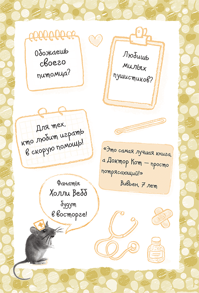 Арахис открыл блокнот, на обложке которого было написано «Книга пушистой первой помощи». Именно в нём Доктор Кот писал медицинские, и в том числе стоматологические, сведения обо всех зверушках, обитавших в Чертополохе.