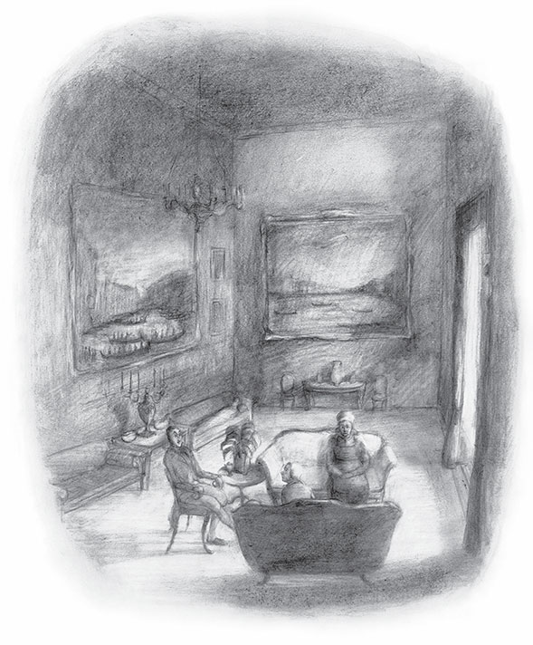 Сэр Уолтер только что поднялся с кресла и стоял в некотором отдалении, разглядывая новоприбывших. В свете свечей видны были его бледность, ввалившиеся глаза и заострившиеся черты. Обычная вежливость требовала, чтобы он подошел и заговорил с гостями, однако сэр Уолтер не трогался с места.