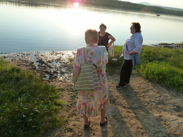 р. Вишера. На берегу видны родники. Это благодаря им вишерская вода всегда холодная, почти ледяная. Вдали на горизонте – Полюдов камень. Красновишерск, поздний вечер, конец июня 2011 г.