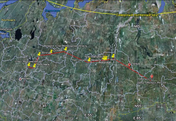 Великий Сибирский путь XVI века: Ярославль – Вологда – Тотьма – Великий Устюг – Кай – городок – Чердынь – Чердынско – Лозвинская дорога: р. Вишера с притоком Вилсуй – р. Лозва – р. Тавда – р. Тобол – Пелым – р. Тобол – Тобольск.