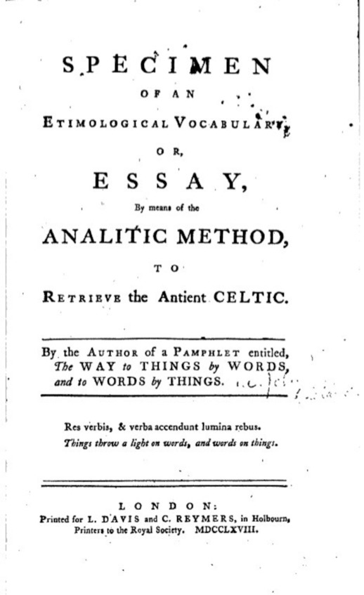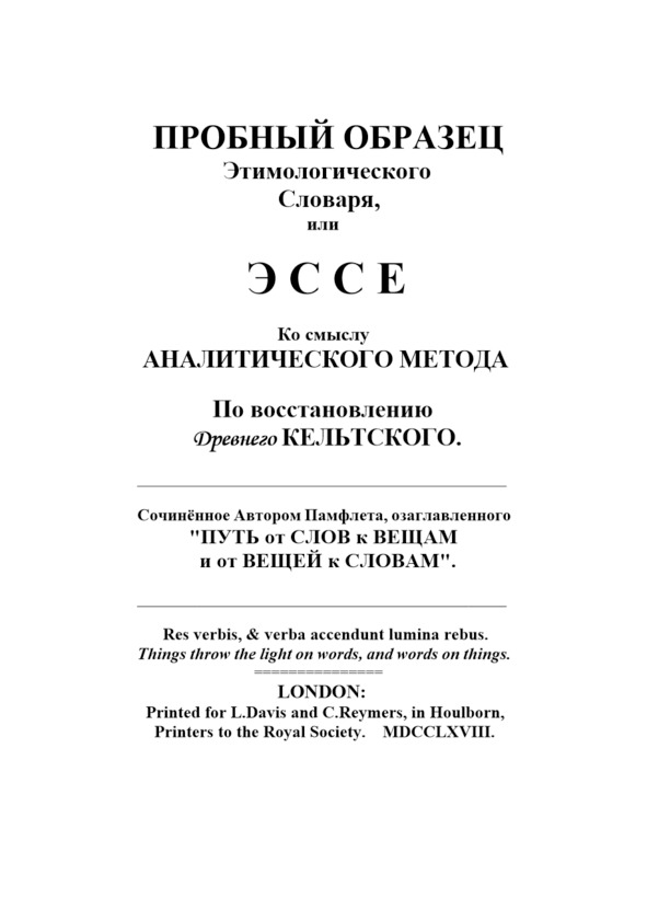 Первое в этом – то, что автор стилизует сие быть вселенским: хотя сам Я не смею утверждать, что Кельтский, – по меньшей мере настолько, насколько Я сам способен судить о том, так и от той точки, с которой Я начал своё новоисследование, – когда-либо являлся вселенски элементарным или, сказать, материнским. То доказуемо, что оный и от Греческого, и от Латыни, от большинства, если не сказать от всех языков Европы, частично Африки и двух Татарий; а сколь далеко корни его проникают аж и в более Южные регионы, Я даже не берусь выяснять. Но в том заглавии, кое (говорит) о вселенском, очевидно, конечно же, что этакое включает в себя и Кельтский.