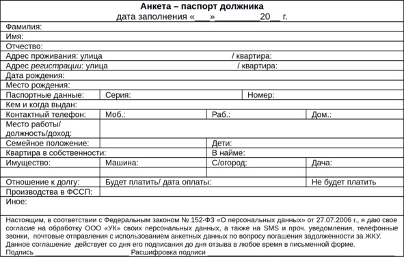После получения указанного уведомления должник, даже если он не намеревается платить, приходит в организацию ЖКХ для пояснения причин просрочки оплаты, а также с целью не допустить в отношении себя санкций. В этот момент собирается как можно больше информации о потребителе и заполняется паспорт должника, берется объяснительная и обязательство погасить долг в определенный срок, т.к. второй такой возможности может не быть.