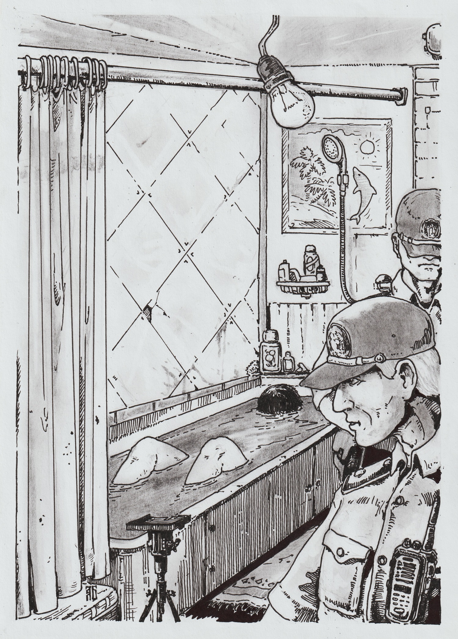 В номере находились сотрудники местной полиции. Они стояли над ванной, наполненной водой багрово красного цвета, над поверхностью воды торчали лишь макушка жертвы и колени, напротив был установлен штатив, но камера была уже снята, и ноутбук со стоящей рядом табуретки находился также у спецов.