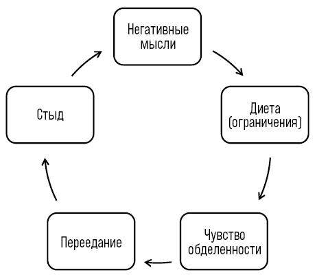 Когда речь заходит о питании и физической активности, клиенты часто сталкиваются с собственным черно-белым мышлением. Некоторые переживают резкие качели, переходя от тщательного подсчета калорий и фанатичного посещения тренажерного зала к срывам на фастфуд и ночным зажорам сладкой или соленой пищей, чтобы расслабиться. Клиент может заявить: «Я держусь в будние дни, а потом расслабляюсь по выходным». Этот менталитет «все или ничего» увлекает клиентов в порочный круг, начинаясь обычно с ограничения любимых продуктов, пропуска приемов пищи или началом изматывающего режима физических тренировок. Чувство голода и ощущение переживаемых лишений часто приводит к ночным походам на кухню (Policy, Coleman, & Herman, 2005). За зажорами приходят чувства вины и стыда, которые вновь запускают тот же цикл, поскольку клиенты с новым рвением приступают к новой диете. Этот цикл многие называют циклом диетоголика, или циклом диета – зажор (рис. 1.1).