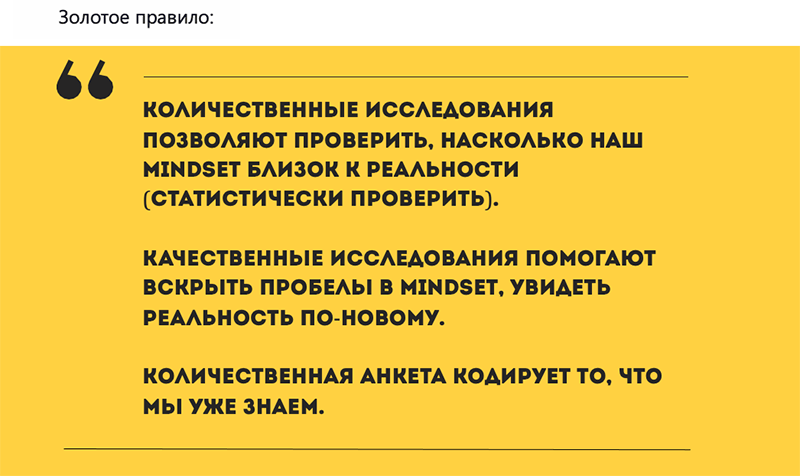 Всегда следует учитывать, к чему именно мы стремимся – увидеть реальность или понять её. В первом варианте мы идём в количественные исследования, изучаем 1000 человек, чтобы увидеть структуру реальности сегодня. Во втором – общаемся с 10 и выявляем архетипы мышления, которые управляют этими тысячами.