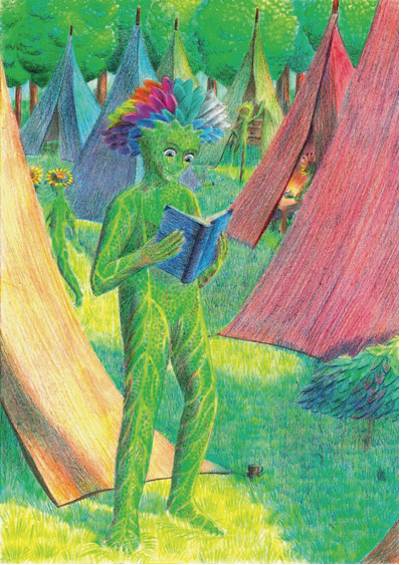 Я помню, как в самом начале её работы на дому к нам пришли 5 сородичей, разные по возрасту. Я так обрадовалась, что познакомилась со всеми. Каждого звали очень интересно – Тули, Хели, Рами, Сиби, Дели – это были дети наших соседей. Мама стала рассказывать, что каждому из нас делать, а они все сели кучно и стали разговаривать, а на меня лишь косились. Я сама встала и присоединилась к началу стола стоя, так я могла быть рядом с ними и предлагать идеи, ведь мы обсуждали вымышленного сородича и пытались его нарисовать. Я предлагала сделать её девочкой и одеть платьице в горошек, а так как кроме меня была ещё лишь Дели, нас заглушили мальчики, которые были за животное вообще. Меня удивило, как быстро Дели отказалась от своих мыслей и стала их поддерживать. А ещё они все были без специальной одежды, которая бы закрывала их полностью. Они были все очень красивы по себе, и их прожилки так естественно делали узор их тел, что им и правда не нужна была дополнительная защита. Потом очень много времени они что-то обсуждали, стороннее от занятия, а когда я к ним приближалась, то хихикали или молчали.