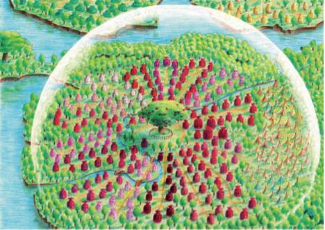 Цивилизация гранатиков потрясла меня своей безграничностью, хотя я знал, что мы под куполом. Они живут кучно, хотя это может показаться не так на первый взгляд, как будто обособленно. Всё дело в том, что они живут по своим островкам (я бы охарактеризовал их целыми мирками), они все вместе встречаются только на центральной аллее, где есть большущее дерево. Что странно, так это то, что некоторые из них могут увидеть всех своих сородичей только один раз в три года*2. Всего у них живет порядка семнадцати оттенков (это я их так назвал), каждый отвечает за своё предназначение, поэтому они живут в согласованном мире. Весь их мир можно обрисовать так (см. рис. 2):