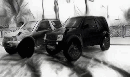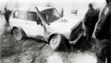 – Ну… По внешнему виду я бы не сказал… Машина была хороша, но происхождение ее нам показалось довольно сомнительным… Ну да это хозяина дело. Парни, заявившиеся на нем в соревы, собирались «сделать всех», и мы с нетерпением ожидали заезда этого «чуда германской мысли». Но… «Гелик» был заявлен аж в конце второй десятки. Прошедшие спринт участники терпеливо ждали, созерцая, как взлетевший в воздух ЦЕЛЫЙ «Джим» братьев Максима и Михаила Кочетовых (они же – «братья Опоссумы») приземлился без заднего стекла (потерял в полете, выбив изнутри незакрепленной лопатой).
