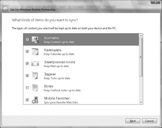 Если при установке Windows Mobile Device Center ваш КПК будет подключен к компьютеру, то мастер задаст вопрос, хотите ли вы установить партнерство между компьютером и коммуникатором. Фактически, под партнерством понимается возможность синхронизации. После того как вы согласитесь на установку партнерства, перед вами отобразится окно для настройки данных, которые будут синхронизироваться (рис. 1.9).