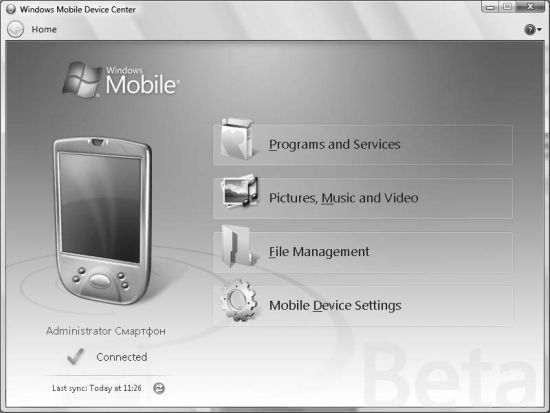 После того как партнерство настроено, мастер Windows Mobile Device Center примет вид, как на рис. 1.10. К сожалению, из этого рисунка нельзя понять, что именно можно сделать при помощи мастера Windows Mobile Device Center, поэтому отдельно рассмотрим его возможности. Итак, с помощью мастера можно: