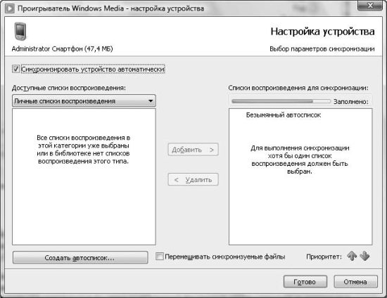 Дважды щелкните кнопкой мыши на значке устройства, и перед вами отобразится мастер Настройка устройства. На первых шагах мастера будут заданы следующие вопросы: хотите ли вы удалить все содержимое MPB-устройства перед выполнением синхронизации, а также хотите ли вы продолжить синхронизацию в том случае, если объем вашего MPB-проигрывателя меньше объема музыкальной библиотеки Проигрывателя Windows Media. После этого откроется окно выбора списков воспроизведения для синхронизации (рис. 1.13). С его помощью можно синхронизировать уже существующие списки. Кроме того, специально для синхронизации вы можете создать новый список, нажав кнопку Создать автосписок.