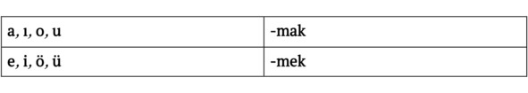 Отрицательная форма инфинитива образуется с помощью аффикса отрицания ma / me (с применением сокращённого закона гармонии гласных) – который помещается перед аффиксом инфинитива – mak / mek.
