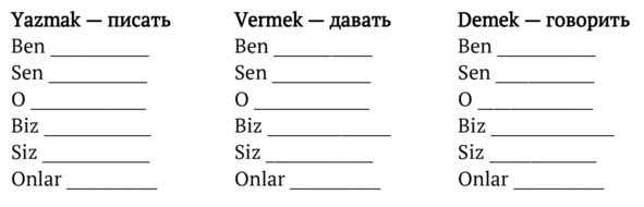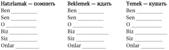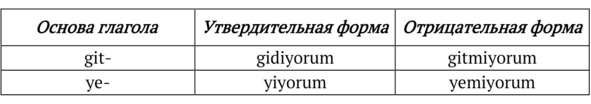 Глаголы etmek, gitmek, seyretmek, tatmak, gütmek – исключения из правила! При прибавлении аффикса -yor стоящая на конце глухая -t меняется на звонкую -d (здесь только для буквы -t действует правило озвончения согласных, которое мы рассматривали в Главе 3. – Находясь между двумя гласными, -t меняется на -d):